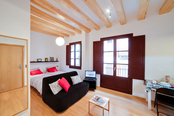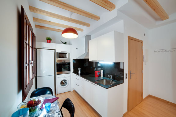 Once inside, the apartment is brand-new and furnished in a comfortable modern style with parquet flooring and maintaining a touch of local authenticity with the original ceiling beams and wooden windows. The kitchen area is compact but modern, and fully equipped with fridge-freezer, vitroceramic hob, microwave oven, coffee maker, toaster, juicer, kettle, pots and pans etc. There is a folding dining table and chairs, seating four people. Barceloneta Market is at the end of the street, less than 1 minute walk from the building, there you can buy very fresh ingredients to cook.
